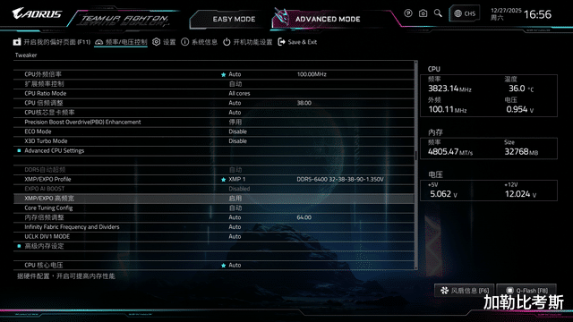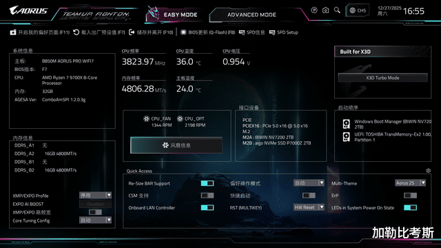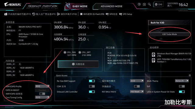 最新的BIOS版块为F7,参加可以看到简便形态下,可以进行内存接洽设立和X3D Turbo Mode设立的快捷选项。技嘉B850M电竞雕主板搭载技嘉D5黑科技、X3D鸡血形态、一键PBO、中枢调优四大黑科技功能。