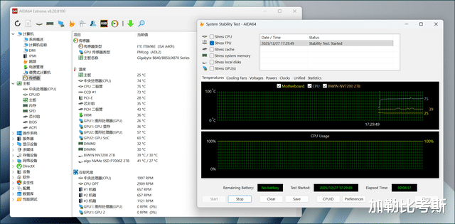 通过AIDA64 进行FPU单烤测试,可以看到CPU温度74度,主板温度25度。