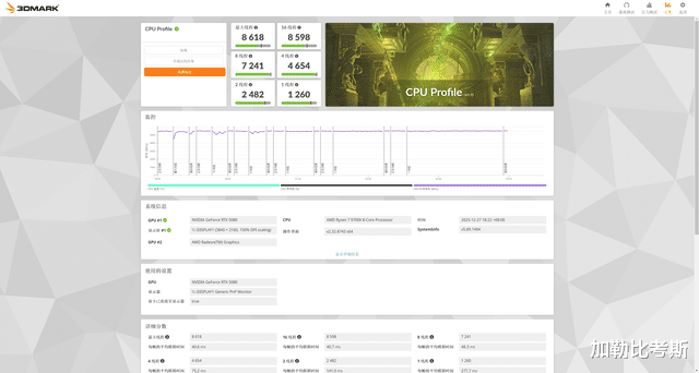 临了再来望望这套整机的性能,当先使用3DMARK内部的CPU Profile进行测试,可以看到CPU性能最大线程得分是8618,单线程得分是1260。