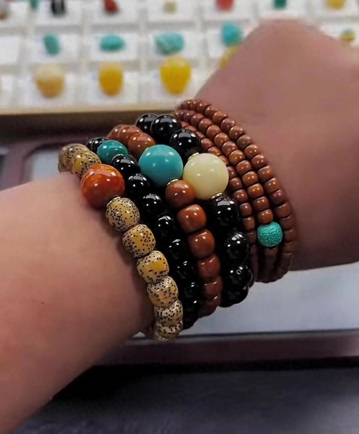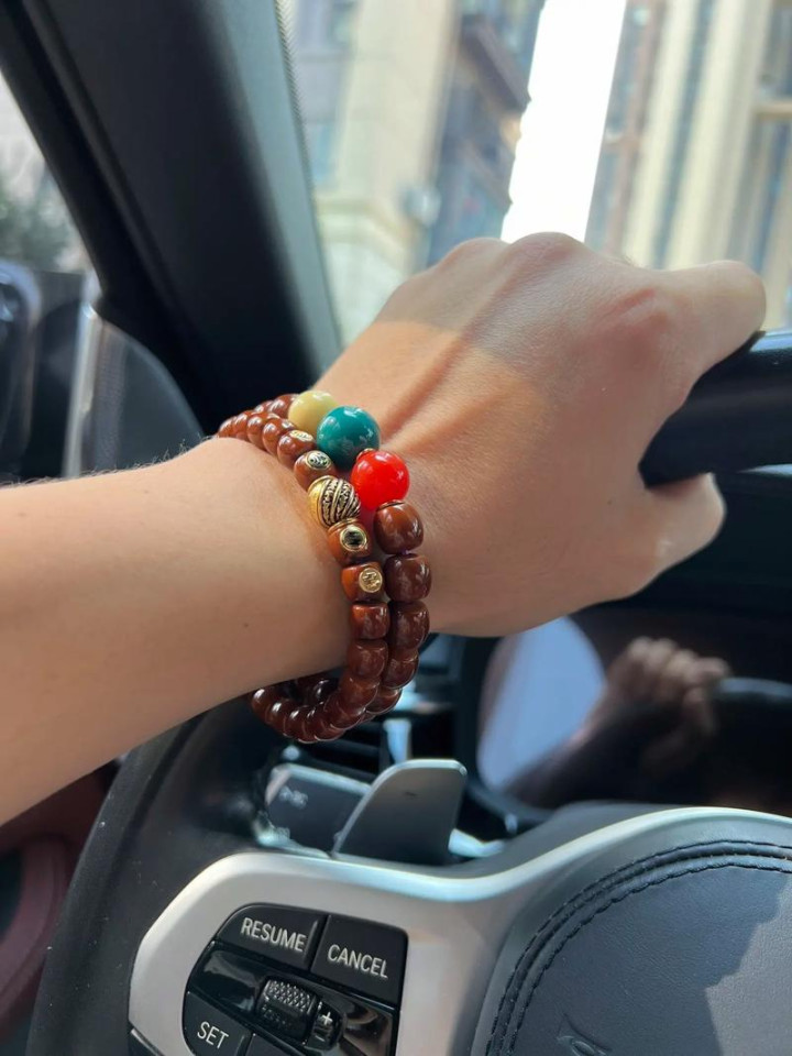 木质类主串(如紫檀、千里香):适当搭配蜜蜡、南红、玉石等温润材质,幸免金属、塑料等冰冷感强的材料。