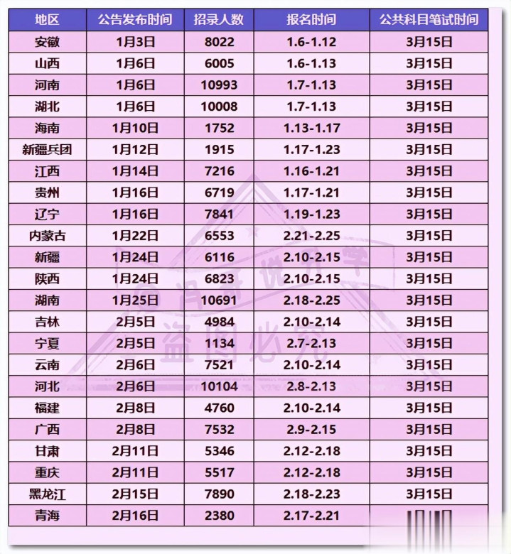 1. 紧盯官方平台:悉数招录信息(公告、职位表、大纲等)齐会在各省东谈主事训练网或组织部官网发布,别依赖第三方平台,幸免错过要道信息。目下惟一宁夏明确2月发公告,其他省份参考往年时代即可。